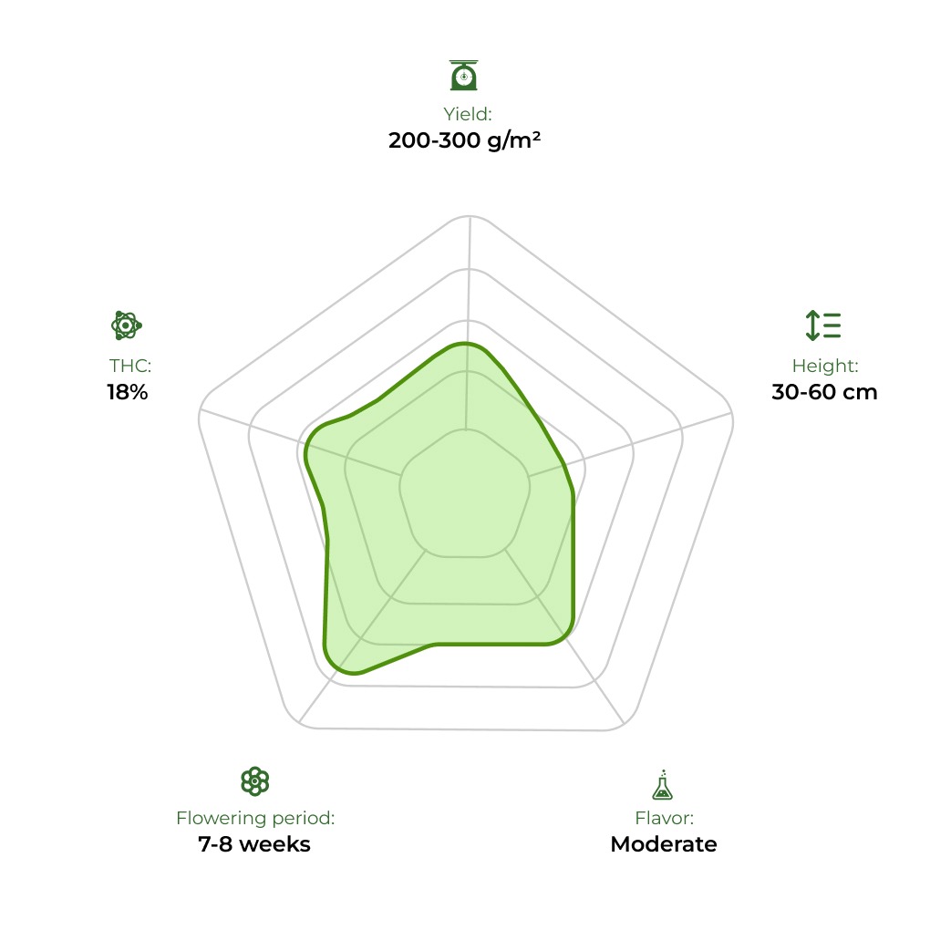 Who hasn’t heard of the good old Lowryder? There are no such growers. Auto Lowryder 2 Feminised is a worthy successor to the legendary strain – a miracle with increased yield, even slightly faster maturing than its already nimble ancestor. While the classic Lowryder bloomed in 60-65 days, this wonder, which also has the famous Santa Maria genetics in its ancestry, can bloom in a record 50-55 days.